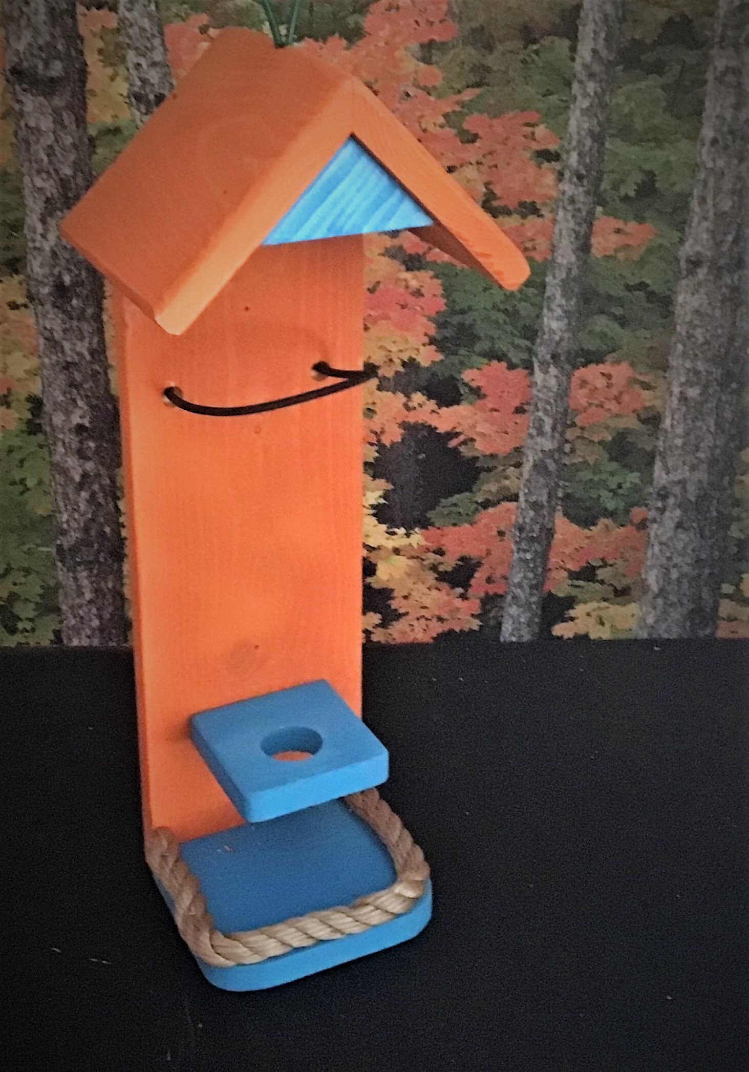 This product is made of spruce and is painted with an exterior grade paint. A roof is built over it to give it some protection from rain or snow. A 5/8" polypropylene rope is used on the bottom to hold the feed in plus allows drainage from the rain. A bungee is used to hold the bottle in tightly. A coated cable is looped on top for hanging option or two stainless steel screws are provided so you can mount it on a tree, post, wooden fence or etc..... Or maybe you just want to set it on a table. This item is portable so if you go camping or to the cabin you can just bring it with you! Enjoy nature's wildlife anywhere. Wine bottle included along with a starter 1lb bag of feed and a paper funnel to add feed in bottle. Once you receive it and open the box, add the feed in the bottle, mount it or not, no reason to head out to the store for anything.