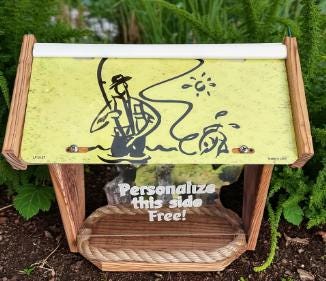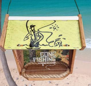 GONE FISHING BIRD FEEDER: made from rustic cedar treated with Thompson's Water Seal. Two aluminum license plates (won't rust) mounted with stainless steel screws and slipped into a white vinyl ridge cap on top. Easy to change plates if you desire. Acrylic plastic with one side "Gone Fishing" or "Gone To The Beach" or have one side personalized if you like (FREE) made with machine cut white exterior vinyl (UV). A beige polypropylene rope is used on both sides to hold feed in and lets water drain out. Bird feeder is hanged by a coated cable line (won't rust). You can a hang feeder from a tree, post, hanger or shepherd's hook.