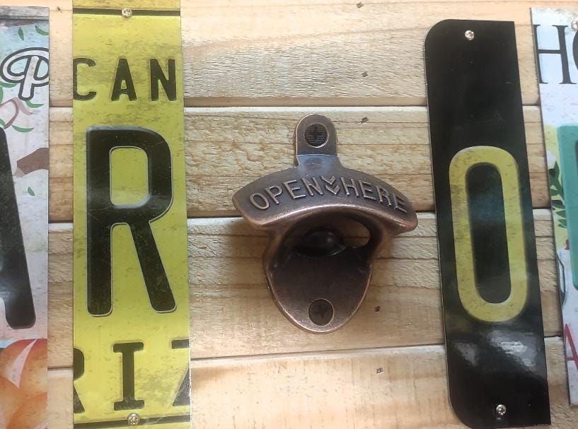 License Plate Strips are secured with #2 brass screws. Wood is made of Cedar cut in strips and has a rustic pallet look weathered finish. Wood strips are attached with galvanized brad nails and exterior glue to the ribs in the back. Wood strips are soaked in Thompsons Water Seal. Two picture hooks are screwed on back side for easy hanging.