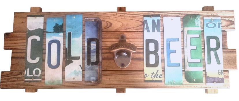 License Plate Strips are secured with #2 brass screws. Wood is made of Cedar cut in strips and has a rustic pallet look weathered finish. Wood strips are attached with galvanized brad nails and exterior glue to the ribs in the back. Wood strips are soaked in Thompsons Water Seal. Two picture hooks are screwed on back side for easy hanging.
