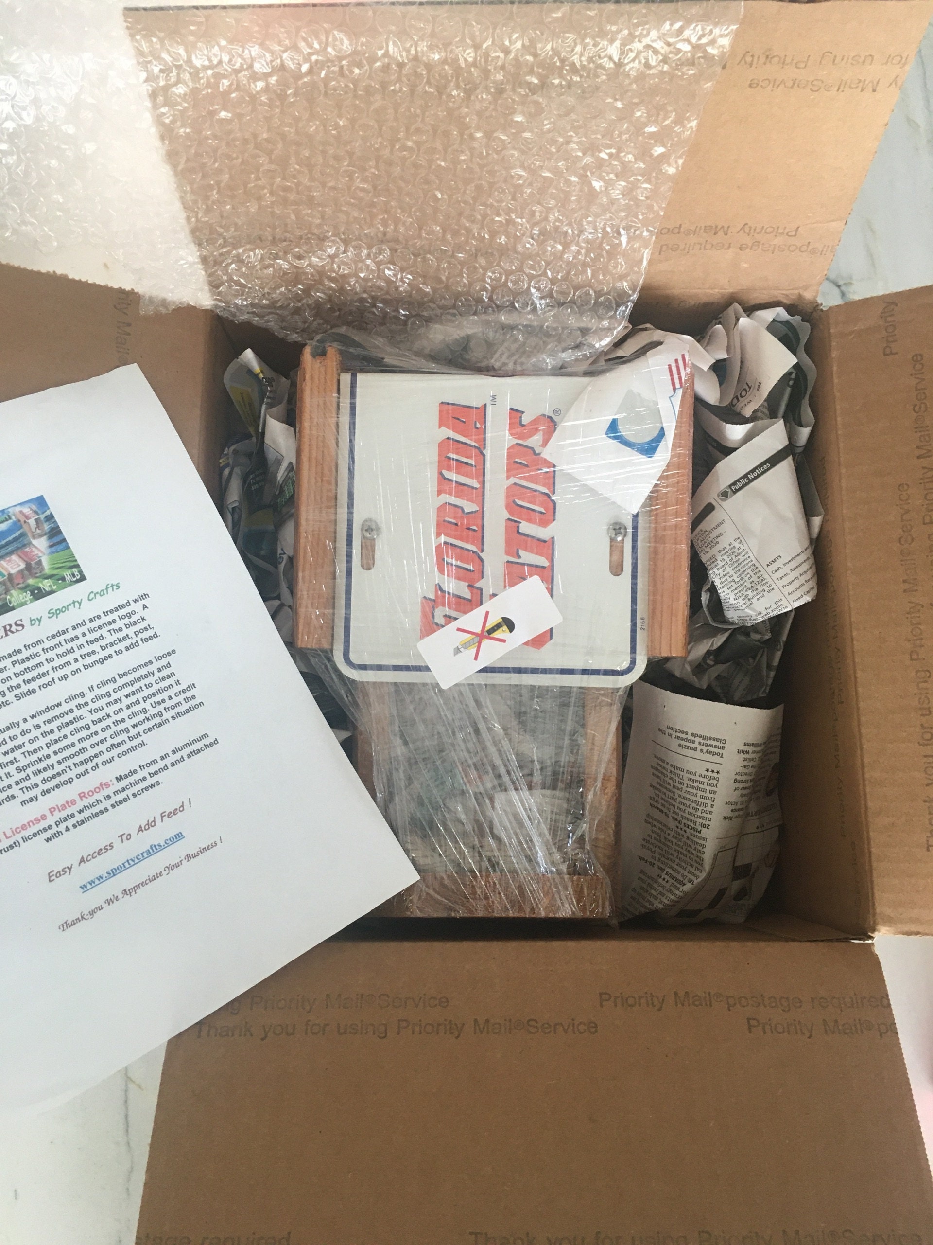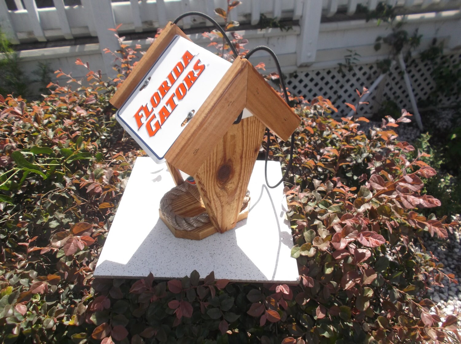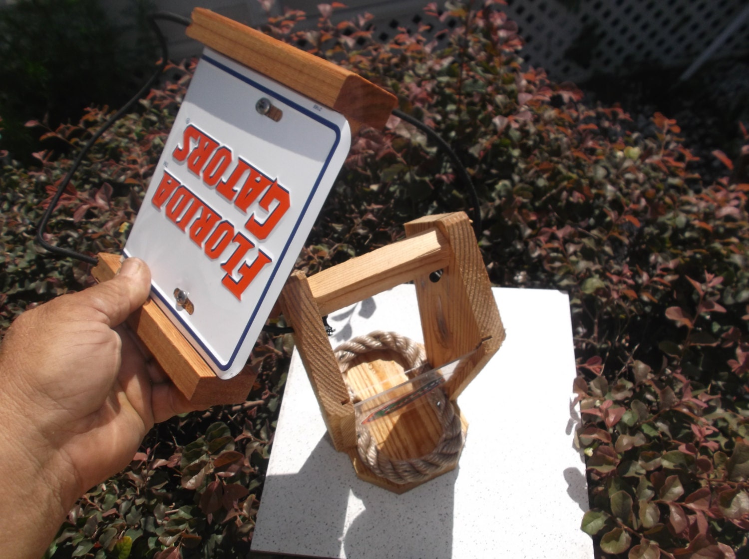 Two-sided Bird Feeder handmade from cedar and treated with Thompsons Water Seal. An actual aluminum license plate (won't rust) is machine bent and attached with 4 stainless steel screws. A license logo on a clear acrylic plastic (logo may vary in style) with a beige polypropylene rope on the base to hold in the feed and allow water to drain. We use a black bungee to hang from a tree, post, hanger or shepherd's hook. Slide roof up on bungee to add feed. In some cases, the bungee can discourage squirrels. NO ASSEMBLE REQUIRED!