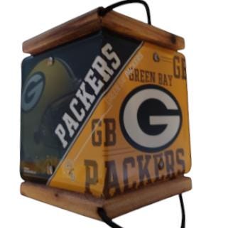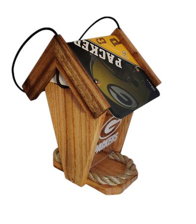 Made from cedar and treated with Thompson's Water Seal. The roof is an aluminum license plate (won't rust) machine bent and attached with 4 stainless steel screws. Beige polypropylene rope used on base to hold feed in and let water drain. Imprint made of white exterior vinyl (UV). Birds can access feed from both sides. A bungee is attached to allow roof to slide up & down to add feed. In some case the bungee can prevent squirrels. It can be hanged from a tree, post, hanger or a shepherd's hook.