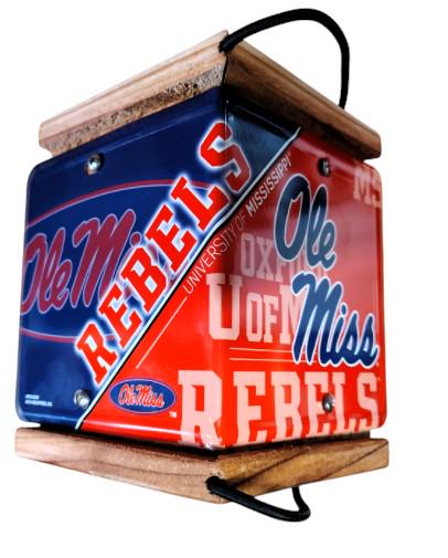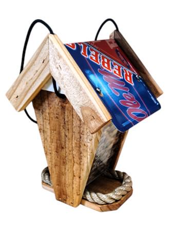 Two-sided Bird Feeder handmade from cedar and treated with Thompsons Water Seal. An actual aluminum license plate (won't rust) is machine bent and attached with 4 stainless steel screws. Front logo and imprints are made from machine cut white exterior vinyl (UV) on a plastic acrylic piece with a beige polypropylene rope on the base to hold in the feed and allow water to drain. We use a black bungee to hang from a tree, post, hanger or shepherd's hook. Slide roof up on bungee to add feed. In some cases, the bungee can discourage squirrels. NO ASSEMBLE REQUIRED!