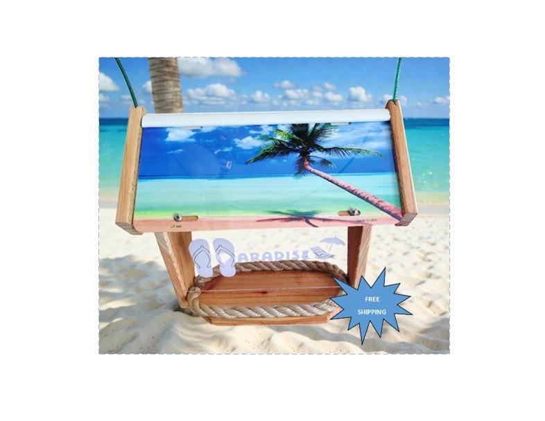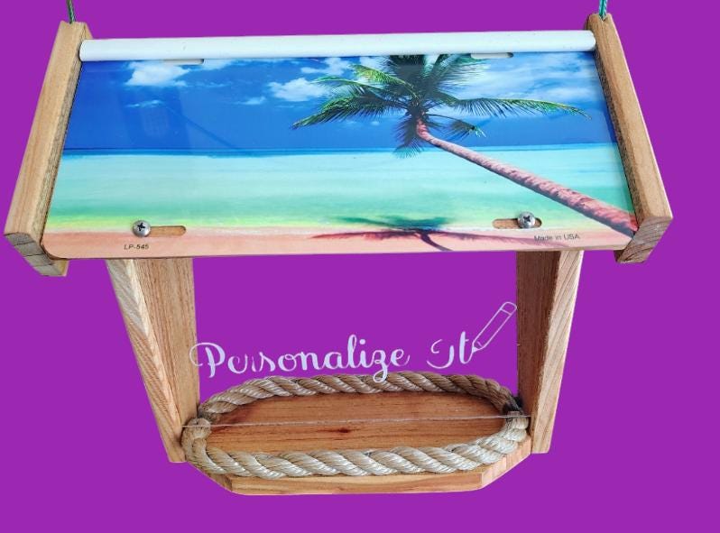 TROPICAL DELUXE BIRD FEEDER: made from rustic cedar treated with Thompson's Water Seal. Two aluminum license plates (won't rust) mounted with stainless steel screws and slipped into a white vinyl ridge cap on top. Easy to change plates if you desire. Acrylic plastic with an imprint of your choice on both sides or personalized one side if you like (no extra charge) made with machine cut white exterior vinyl (UV). A beige polypropylene rope is used to hold feed in and lets water drain out. Bird feeder is hanged by a coated cable line. You can a hang feeder from a tree, post, hanger or shepherd's hook.