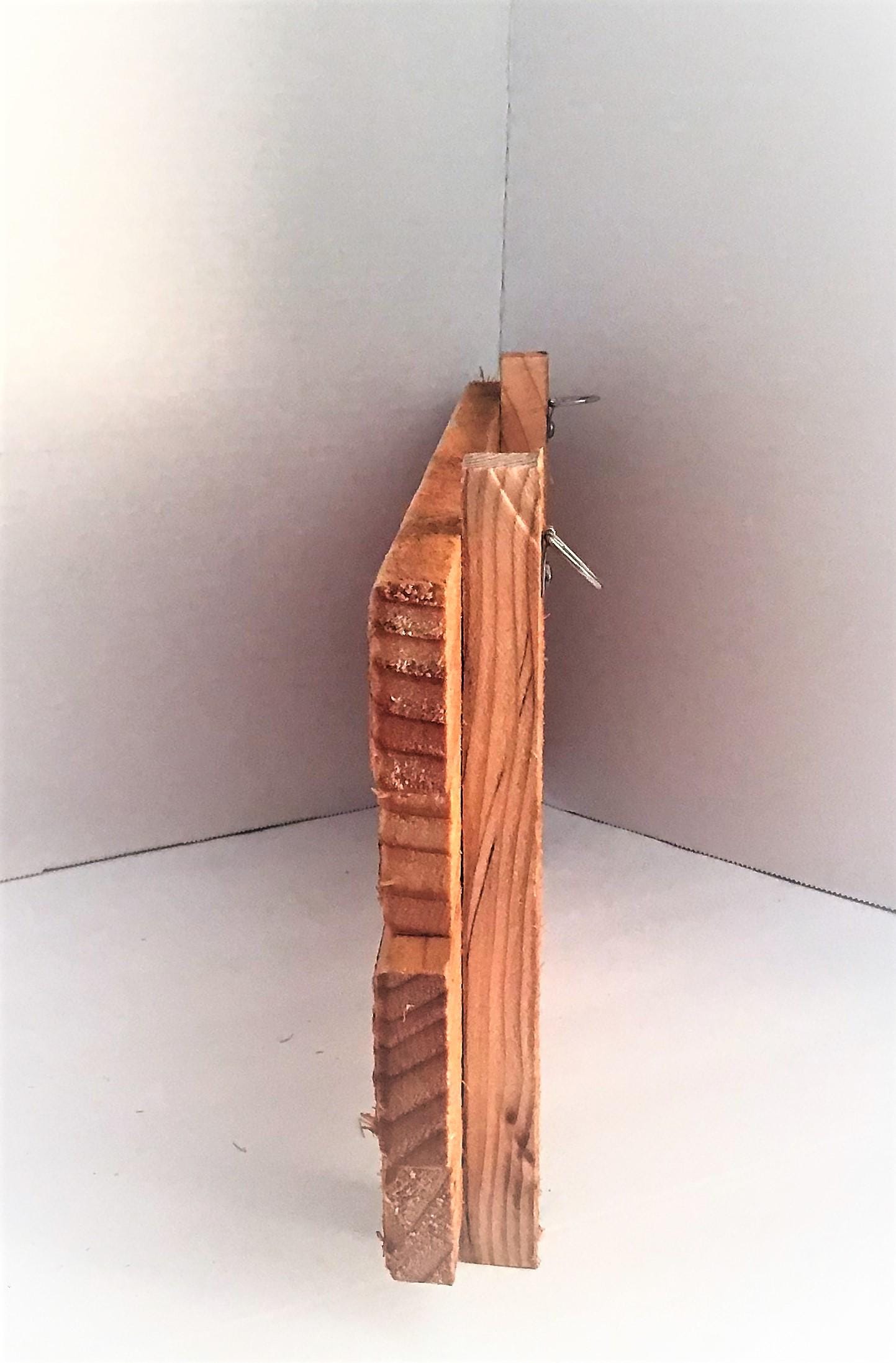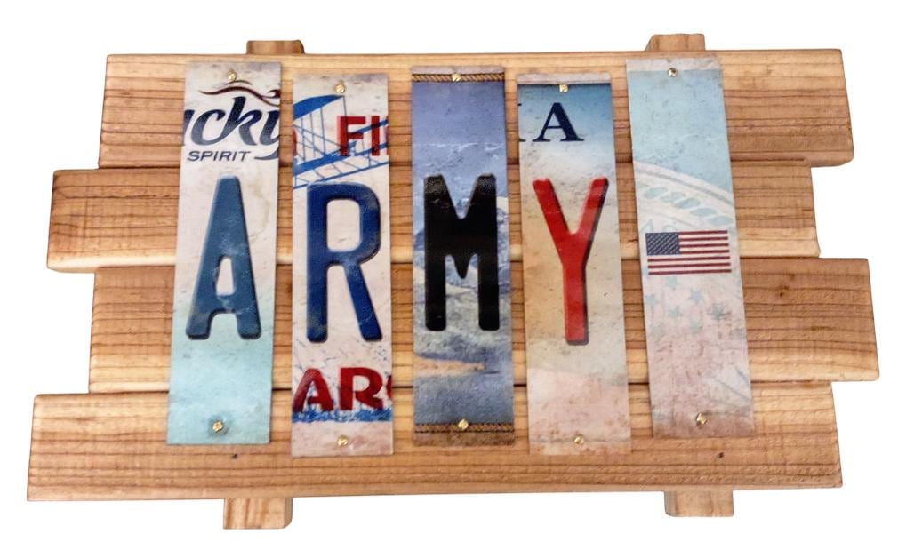 License Plate Strips are secured with #2 brass screws. Wood is made of Cedar cut in strips and has a rustic pallet look weathered finish. Wood strips are attached with galvanized brad nails and exterior glue to the ribs in the back. Wood strips are soaked in Thompsons Water Seal. Two picture hooks are screwed on back side for easy hanging.