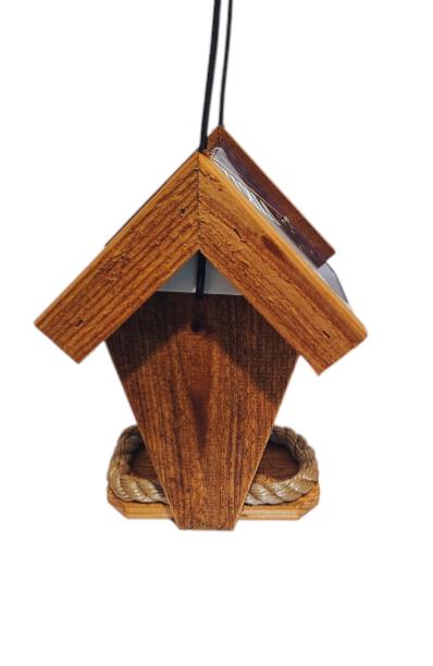 Made from cedar and treated with Thompson's Water Seal. The roof is an aluminum license plate (won't rust) machine bent and attached with 4 stainless steel screws. Beige polypropylene rope used on base to hold feed in and let water drain. Imprint made of white exterior vinyl (UV). Birds can access feed from both sides. A bungee is attached to allow roof to slide up & down to add feed. In some case the bungee can prevent squirrels. It can be hanged from a tree, post, hanger or a shepherd's hook.