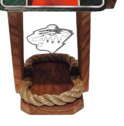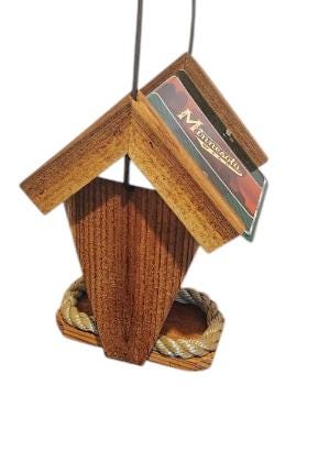 Made from cedar and treated with Thompson's Water Seal. The roof is an aluminum license plate (won't rust) machine bent and attached with 4 stainless steel screws. Beige polypropylene rope used on base to hold feed in and let water drain. Imprint made of white exterior vinyl (UV). Birds can access feed from both sides. A bungee is attached to allow roof to slide up & down to add feed. In some case the bungee can prevent squirrels. It can be hanged from a tree, post, hanger or a shepherd's hook.