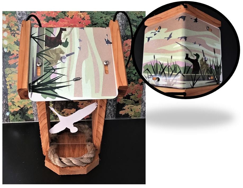 DUCK HUNTING: two-sided Bird Feeder handmade from cedar and treated with Thompsons Water Seal. An actual aluminum license plate (won't rust) is machine bent and attached with 4 stainless steel screws. A white vinyl Duck cut on a clear acrylic plastic with a beige nylon rope on the base to hold in the feed. We use a black bungee to hang from a tree, post, hanger or shepherd's hook. Slide roof up on bungee to add feed.
