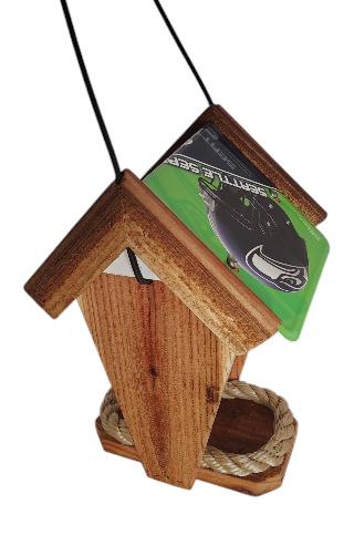 Two-sided Bird Feeder handmade from cedar and treated with Thompsons Water Seal. An actual aluminum license plate (won't rust) is machine bent and attached with 4 stainless steel screws. A license logo on a clear acrylic plastic (logo may vary in style) with a beige polypropylene rope on the base to hold in the feed and allow water to drain. We use a black bungee to hang from a tree, post, hanger or shepherd's hook. Slide roof up on bungee to add feed. In some cases, the bungee can discourage squirrels. NO ASSEMBLE REQUIRED!
