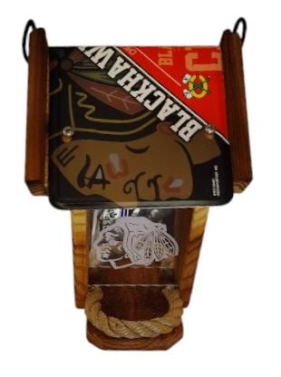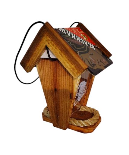 Two-sided Bird Feeder handmade from cedar and treated with Thompsons Water Seal. An actual aluminum license plate (won't rust) is machine bent and attached with 4 stainless steel screws. A license logo made of white exterior vinyl (UV) on a clear acrylic plastic with a beige polypropylene rope on the base to hold in the feed and allow water to drain. We use a black bungee to hang from a tree, post, hanger or shepherd's hook. Slide roof up on bungee to add feed. In some cases, the bungee can discourage squirrels. NO ASSEMBLE REQUIRED!